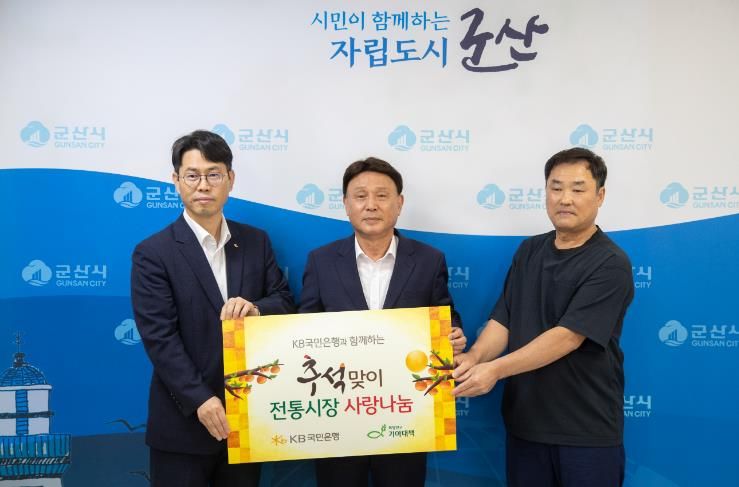 전달식에 참석한 KB군산종합금융센터 서성수 지점장은 “추석 명절을 맞아 경제적 어려움을 겪는 이웃들에게 작은 위로가 되고, 경기침체로 힘든 시기를 보내고 있는 지역 전통시장에도 활력이 되기를 바란다.”라며 “앞으로도 KB국민은행은 나눔문화 확산에 앞장서겠다.”라고 밝혔다.
