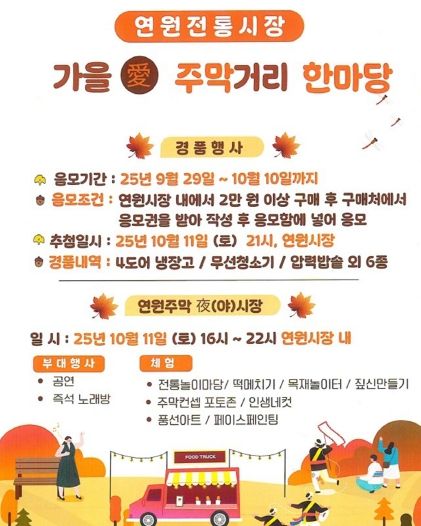 또한 10월 10일까지 연원시장을 이용한 고객을 대상으로 응모권을 배부하고 축제 당일 오후 9시에는 경품 추점 이벤트도 진행될 예정이다.