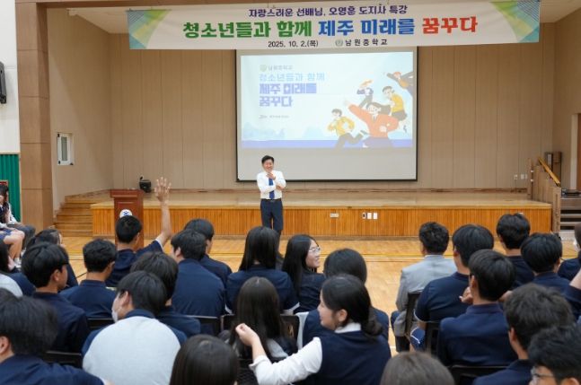 [한국기자연대] 오영훈 제주특별자치도지사는 2일 남원중학교(교장 오경석)를 찾아 전교생을 대상으로 특별강연을 열고, “남원과 제주를 넘어 아시아, 나아가 우주까지 여러분의 무대가 돼야 한다”며 청소년들의 꿈과 도전을 격려했다.
