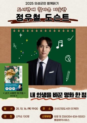 [한국기자연대] 의성군은 오는 10월 16일 의성군립도서관에서 정우철 도슨트를 초청해 '내 인생을 바꾼 명화 한 점'을 주제로 저자강연을 개최한다고 밝혔다.
