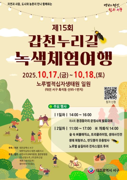 [한국기자연대] 대전 서구는 이달 17일부터 18일까지 노루벌 적십자생태원에서 자연과 환경을 사랑하는 시민들을 위한 ‘제15회 갑천누리길 녹색체험여행’을 대한적십자사 대전·세종지사와 공동으로 개최한다.