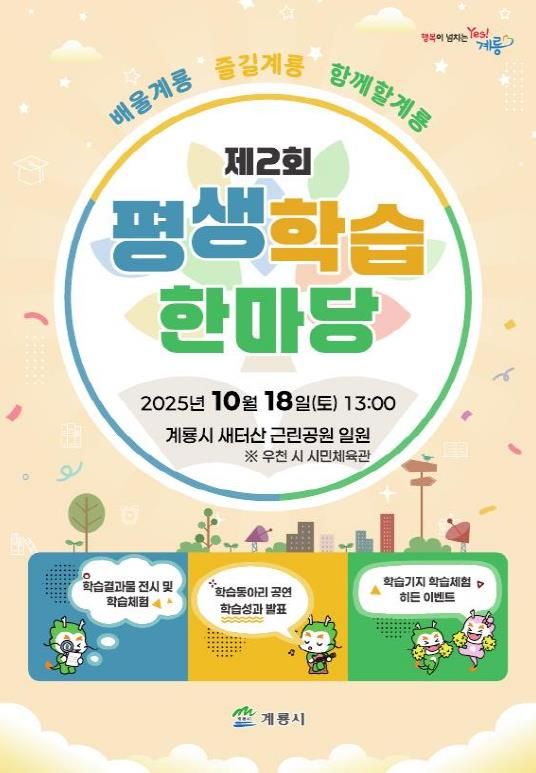 [한국기자연대] 계룡시는 오는 18일 오후 1시부터 시청 앞 새터산 근린공원에서 시민이 주도하는 배움의 축제 “2025 제2회 계룡시 평생학습 한마당”을 개최한다고 밝혔다.
