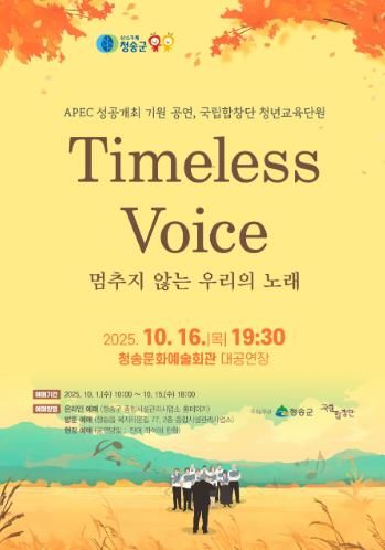 [한국기자연대] 청송군은 오는 16일 저녁 7시 30분, 청송문화예술회관 대공연장에서 APEC 성공개최를 기원하는 국립합창단 청년교육단원 공연 ‘Timeless Voice – 멈추지 않는 우리의 노래’를 개최한다.