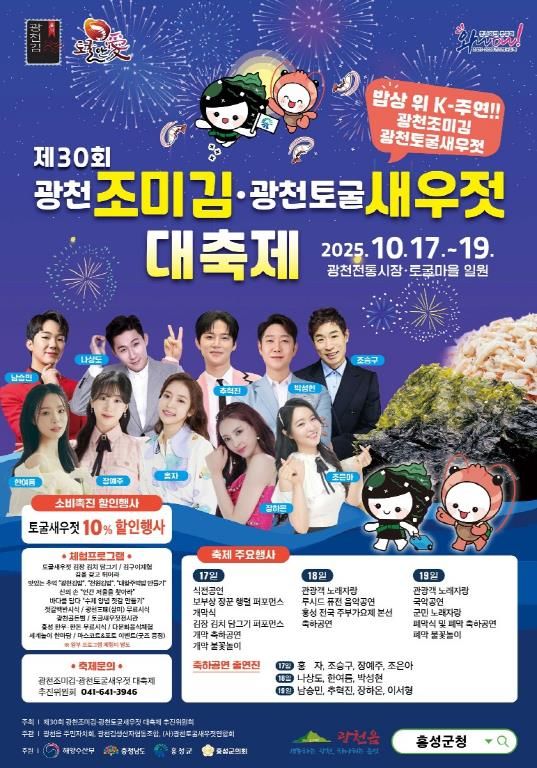 [한국기자연대] 홍성군 광천읍은 오는 17일부터 19일까지 3일간 광천전통시장 및 토굴마을 일원에서 ‘제30회 광천조미김·광천토굴새우젓 대축제’의 성대한 막을 올릴 예정이라고 밝혔다.