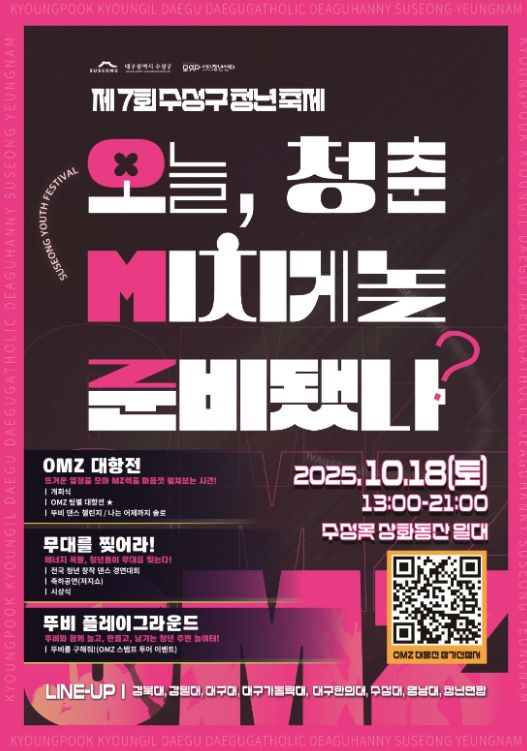 [한국기자연대] 대구 수성구는 오는 18일 수성못 상화동산 일대에서 ‘2025 제7회 수성구 청년축제’를 개최한다.