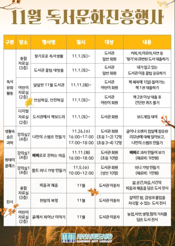 [한국기자연대] 사천시는 사천시립도서관에서 11월 한 달 동안 책과 함께 여유로운 시간을 보내며 감성을 채울 수 있는 다양한 독서문화행사와 체험 프로그램을 운영한다고 17일 밝혔다.