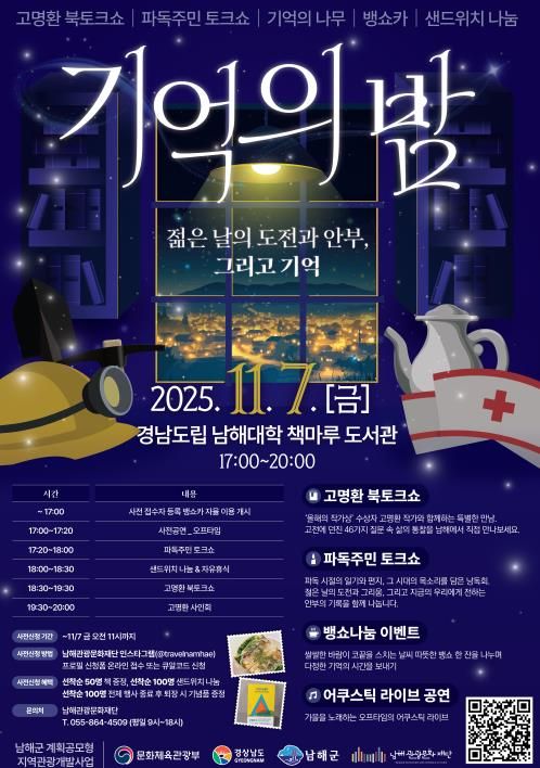 [한국기자연대] ‘젊은 날의 도전과 안부, 그리고 기억’이라는 주제로 독일마을 기억의 밤 행사가 오는 11월 7일 17시부터 경남도립남해대학 책마루도서관에서 열린다.