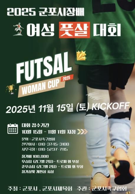 [한국기자연대] 군포시는 여성 생활체육 참여 확대와 건전한 스포츠 문화 확산을 위해 ‘2025 군포시장배 여성 풋살대회’를 오는 11월 15일(토) 군포시 국민체육센터 축구장에서 개최한다.