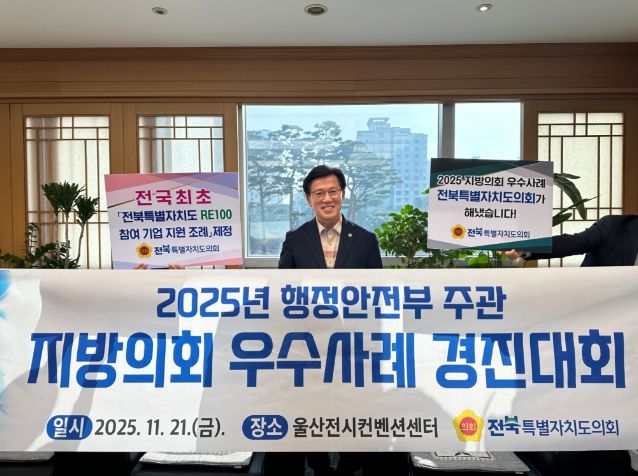 [한국기자연대] 전북특별자치도의회가 지난 21일 울산전시컨벤션센터에서 열린 행정안전부 주관 ‘2025년 지방의회 우수사례 경진대회’에서 본선에 진출해 수상하는 영예를 안았다.