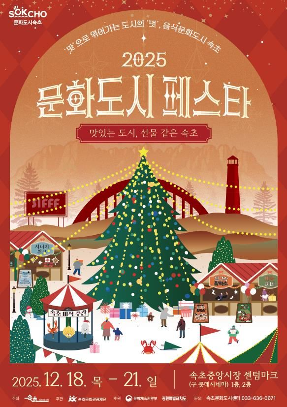 [한국기자연대] (재)속초문화관광재단은 속초시의 대한민국 문화도시 1년 차 사업을 마무리하며 오는 12월 18일부터 21일까지 4일간 속초중앙시장 센텀마크(구 롯데시네마) 에서 대한민국 문화도시 성과공유회‘2025 문화도시 페스타’를 개최한다.