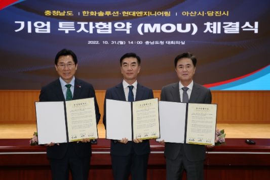 [한국기자연대] 아산시는 31일 충남도청에서 김태흠 도지사, 한화솔루션(주) 사장과 공장 신설을 위한 투자협약을 체결했다.