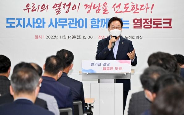[한국기자연대] 박완수 경상남도지사는 14일 오후 도청 도정회의실에서 사무관 직원 200여 명과 대화의 시간을 마련하고 소통 행보를 이어갔다.