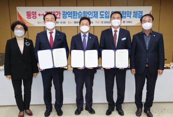 [한국기자연대] 경남도는 15일 오후 통영시청에서 ‘통영-거제 대중교통 광역환승할인제 도입’을 위한 업무협약을 체결했다.