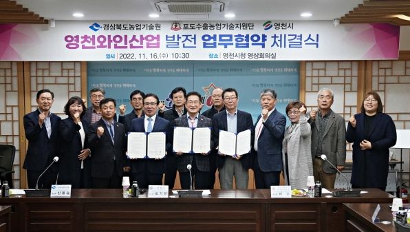[한국기자연대] 영천시는 16일 경상북도 농업기술원, 포도수출농업기술지원단과 와인산업 발전 업무협약을 체결했다.