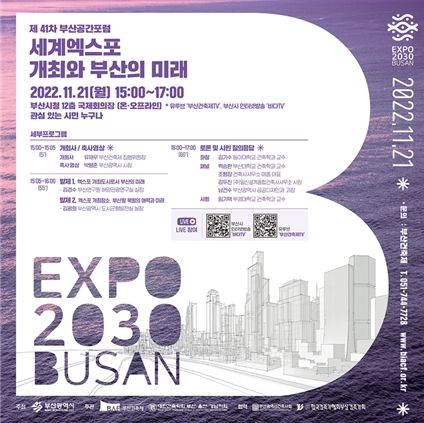 부산시가 주최하고 (사)부산건축제 조직위원회(조직위원장 서의택)와 (사)대한건축학회 부산울산경남지회(회장 이상진)가 공동 주관하는 ‘부산공간포럼’은 도시건축의 주요 현안을 건축전문가와 시민들이 함께 모이는 담론의 장이다. 이번 포럼에서는 2030 부산세계박람회 유치를 위해 도시건축의 강점과 미래 가치에 대한 토론을 펼칠 예정이다.