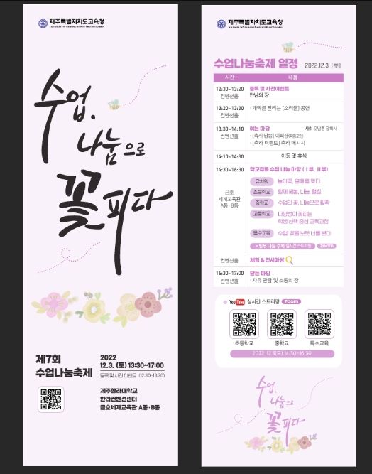 [한국기자연대] 제주특별자치도교육청은 12월 3일 한라대학교 한라컨벤션센터에서‘수업, 나눔으로 꽃피다’라는 주제로 제7회 수업나눔축제를 개최한다. 축제는 유・초・중・고・특수학교 도내 전 교원을 대상으로 대면과 일부 온라인 방식으로 진행된다.