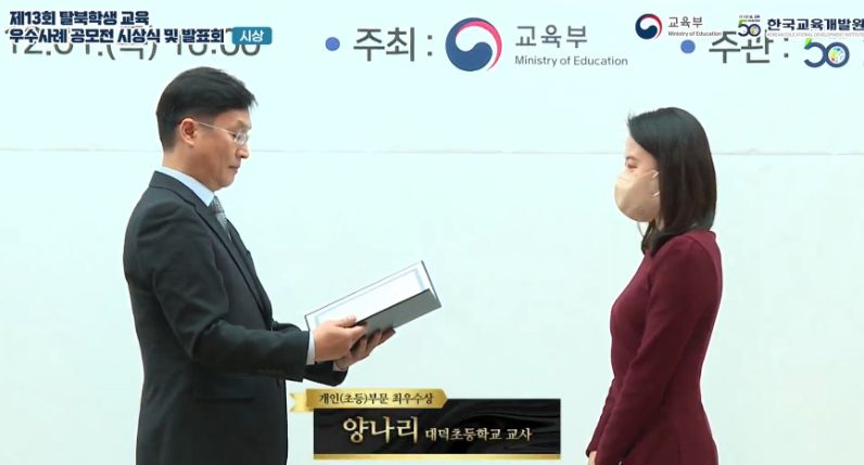 대전광역시교육청은 대덕초등학교 양나리 교사가 전국 최우수상을 수상하여 부총리 겸 교육부장관상과 상금을 받게 됐다. 양나리 교사는 ‘온 마음을 담아 너를 응원해’라는 제목으로 2021년부터 운영한 탈북학생 1:1 멘토링 교육 사례를 응모했다. 학생의 개인 수준에 맞는 학습 멘토링과 다양한 경험을 제공하는 문화 멘토링을 운영하여 학생 성장에 기여한 부분을 인정받았다.