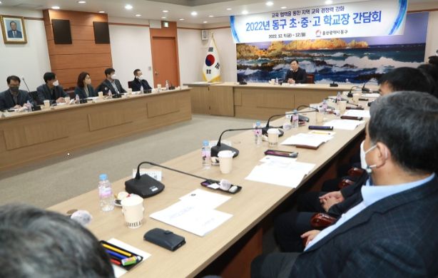 [한국기자연대] 울산시 동구청은 12월 12일 오후 2시 동구청 2층 상황실에서 동구지역 중고등학교 교장 18명을 초청해, 교육 협력을 통한 지역 교육 경쟁력 강화를 위한 학교장 간담회를 개최했다.