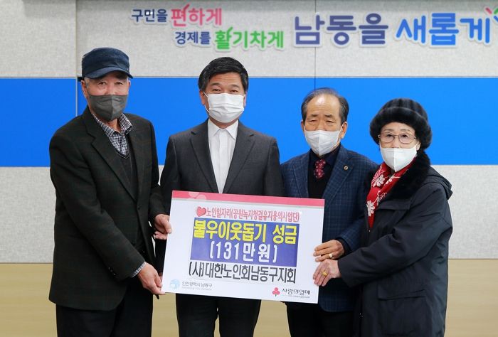[한국기자연대] 인천시 남동구는 최근 (사)대한노인회 인천 남동구지회의 노인 일자리 사업에 참여하는 어르신들로부터 불우이웃돕기 성금 131만 원을 전달받았다고 13일 밝혔다.