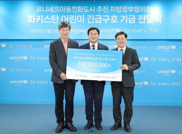 유니세프아동친화도시 추진 지방정부협의회는 국내 유니세프아동친화도시 추진을 위해 100개 지자체가 가입한 협의체다. 이번 기부에 앞서 협의회는 지난 4월 우크라이나 어린이 긴급구호 1억원, 스리랑카 바티칼로아시 ‘유니세프아동친화도시’ 조성 기금 1억원 등을 유니세프한국위원회에 기부하며 지구촌 어린이를 적극 지원하고 있다.
