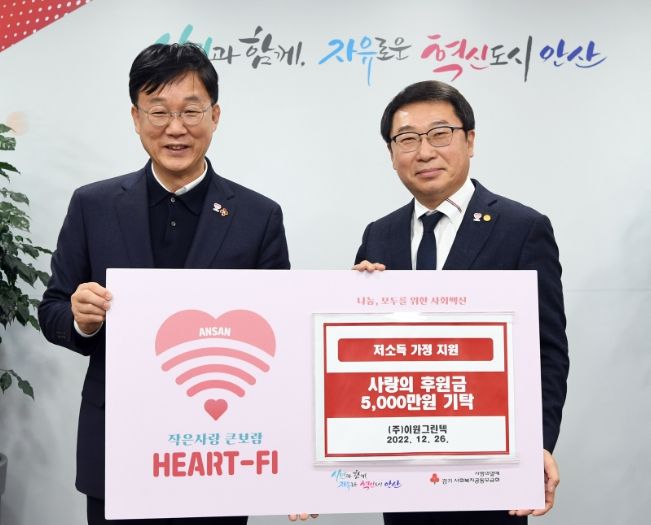 [한국기자연대] 안산시는 지난 26일 ㈜이원그린텍으로부터 연말 이웃돕기 성금 5천만 원을 기탁받았다고 27일 밝혔다.