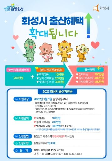 화성시는 저출산 극복을 위한 정책 중의 하나로 기존 셋째 아동 출생 시부터 지원하던 출산지원금을 2023년 1월 1일 출생 아동부터 첫째 100만원, 둘째·셋째 200만원, 넷째이상 300만원을 지원한다.