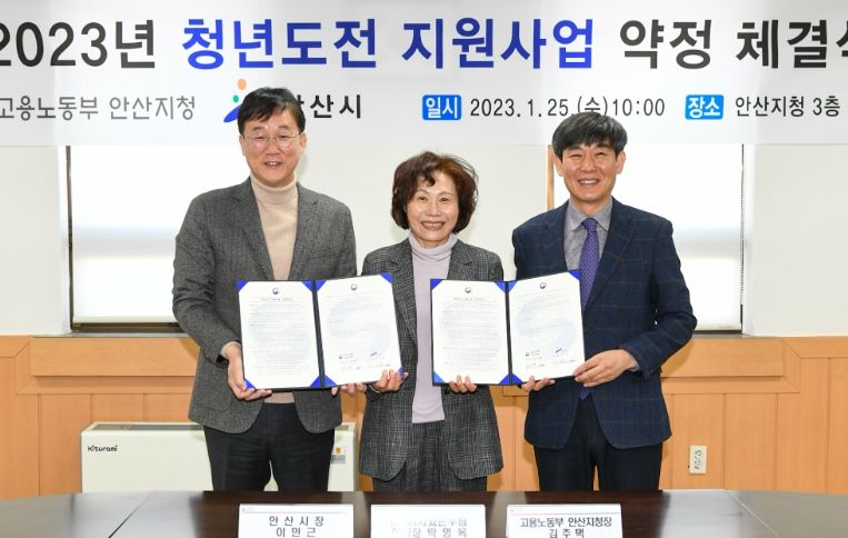 이날 안산시와 고용노동부 안산지청은 지청 회의실에서 ‘2023년 청년도전 지원사업 약정 체결식’을 열고 청년 취업 지원을 위해 함께 노력하기로 뜻을 모았다.