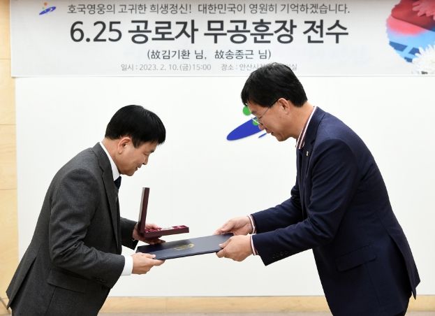 [한국기자연대] 안산시는 10일 6·25 참전유공자인 고(故) 김기환 상사와 고(故) 송종근 일병에게 각각 충무무공훈장과 화랑무공훈장을 전수했다고 12일 밝혔다.