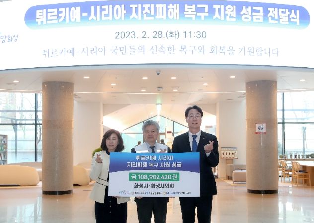 [한국기자연대] 화성시는 28일 화성시민 및 공직자·공공기관 직원들이 튀르키예‧시리아 지진피해 복구를 위해 모금한 성금을 대한적십자회에 전달했다.