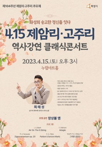 [한국기자연대] 화성시가 제104주년 4.15 제암리·고주리 학살사건 추모제를 맞아 15일 오후 3시 누림아트홀에서‘화성 제암리·고주리 역사강연 클래식콘서트’를 개최한다.