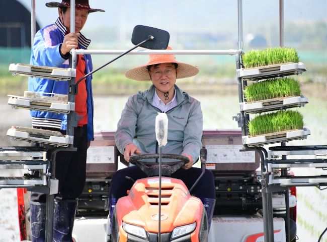 이민근 시장은 현장에서 직접 모판을 나르고 승용이앙기로 모내기를 하며 풍년을 기원하고 고품질 안산쌀 확대 생산을 위한 결의를 다졌다.