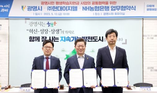 협약에 따라 광명시는 평생학습지원금 예산지원 및 총괄관리를 맡고, ㈜현대이지웰은 신청·사용 플랫폼 제공, 제휴업체 및 포인트 관리를, NH농협은행은 카드 발급과 지원금 정산을 각각 담당한다.