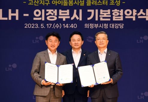의정부시는 5월 17일 시청 대강당에서 한국토지주택공사(LH)와 ‘고산지구 아이돌봄시설 클러스터 조성 업무협약’을 체결했다.