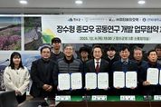 [한국기자연대] 장수군은 장수한우지방공사, 이티바이오텍(주), 전북대학교와 장수군청 회의실에서 장수한우 품질 고급화를 위한 ‘장수형 저탄소 종모우 개발’ 공동연구 상호협력 업무협약(MOU)을 체결했다고 11일 밝혔다. 이번 협약은 협약기관 간 상호 업무협조 체계를 구축해 장수 한우 산업의 경쟁력을 높이기 위한 장수 지역 사양환경에 적합한 우수 유전자원을 확보하고, 탄소배출을 줄이면서도 생산성과 품질을 높일 수 있는 종모우 개발을 위해 마련됐다. 특히 종모우 개발을 통해 장수 한우 고유의 유전형질을 확립하고 탄소배출 저감과 생산성 향상을 동시에 달성하는 것이 핵심 목표다. 협약에 따라 군은 저탄소 종모우 개발을 위한 사업 총괄 및 행·재정적 지원을 하고 장수한우지방공사는 채정·가공·사양관리와 농가 컨설팅에 나선다. 또한 이티바이오텍은 유전체 기반 연구개발을 진행하고 전북대학교는 유전 능력 평가와 우량 암소·후보 종모우 선발을 각각 담당한다. 장수군은 이번 공동연구를 최근 지정된 전북특별자치도 농생명산업지구 내 ‘저탄소한우 산업지구’ 조성사업과 연계해 2030년까지 단계적으로 추진할 계획이