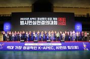 [한국기자연대] 경주시가 2025년 APEC 정상회의 개막을 한 달 앞두고 시민의 힘을 하나로 모아 성공개최 의지를 다졌다. 시는 30일 경주실내체육관에서 ‘2025년 APEC 정상회의 성공개최 범시민실천결의대회’를 성황리에 개최했다고 밝혔다. 이번 행사에는 APEC 범시도민지원협의회(공동회장 박몽룡·이상걸) 소속 회원을 비롯해 유관기관, 시민단체, 자원봉사자 등 경주시민 3천여 명이 참석해 시민과 함께하는 APEC의 진정한 의미를 되새겼다. 특히 주낙영 경주시장을 비롯해 김석기 국회 외교통일위원장, 이동협 경주시의장, 최병준 경북도의회 부의장을 비롯해 시·도의원 전원이 참석해 시민과 함께 손님맞이 실천 결의를 다지고 성공 개최를 향한 열기를 더했다. 행사장 내부에는 시민단체들이 자체 제작한 손님맞이 실천 결의 현수막이 곳곳에 걸려 있어, APEC 성공개최를 향한 시민들의 뜨거운 참여 의지를 생생하게 보여주었다. 본행사에 앞서 참석자들은 ‘APEC 시민 10대 실천과제’를 함께 되새기며, 모든 시민이 APEC의 주인으로서 행동할 때 성숙한 시민의식과 지속가능한 경주를 만들어 갈 수 있다
