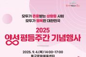 [한국기자연대] 인천 동구는 오는 9월 4일 양성평등주간을 맞아 동구문화체육센터에서 ‘2025년 양성평등주간 기념행사’를 개최한다고 밝혔다. ‘모두가 존중받는 성평등사회, 모두가 행복한 대한민국’이라는 슬로건으로 진행되는 이번 행사는 남녀가 함께 일·가정의 조화를 통해 건강하고 행복한 삶을 영위하는 양성평등문화 확산을 위해 매년 진행하고 있다. 행사는 대한민국 국악축전에서 은상을 수상한 그룹‘시아’의 퓨전국악 공연으로 화려한 서막을 연다. 이어 양성평등 실현에 앞장선 양성평등 발전 유공자에게 표창을 수여하여 격려하는 등 기념식이 진행된다. ‘SBS 동상이몽’ 등 다양한 방송을 통해 금슬 좋은 부부의 모습으로 대중의 공감을 받아온 개그맨 김재우가 양성평등주간을 기념하여 부부사이 긍정적인 소통 방법을 강연한다. 부대행사로 동구 여성회관 수강생들의 작품전시회도 열린다. 또한 양성평등 관련 정책을 수행하고 있는 동구여성단체협의회, 동구가족센터, 인천동부해바리기센터 등 7개 기관 및 단체가 참여한 각종 홍보(체험)부스를 운영하여 행사 참여자들에게 다양한 볼거리를 제공할 계획이다. 김