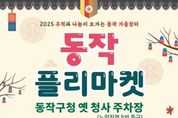 [한국기자연대] 동작구가 오는 11월 1일 오전 10시부터 오후 5시까지 구청 옛 청사 주차장(노량진역 5번 출구)에서 ‘2025 추억과 나눔이 오가는 동작 가을장터’를 연다고 밝혔다. 이번 행사는 주민과 단체가 직접 참여하는 ‘플리마켓’과 김장철 맞이 ‘직거래장터’를 한자리에서 즐길 수 있도록 기획됐다. 먼저 플리마켓은 약 30개 부스에서 의류, 도서, 소품 등 다양한 중고 물품을 판매하며 일상 속 자원순환 문화를 실천하는 장으로 마련된다. 직거래장터에서는 자매결연 도시 등에서 들여온 김장철 필수 품목(배추, 무, 고춧가루 등)과 지역특산물이 시중가보다 최대 33% 저렴하게 판매된다. ▲축산물 타임세일(11시·13시·15시) ▲선착순 증정품 지급 ▲당일 배달서비스(박스 단위, 관내 한정) ▲칼갈이 부스(인당 2개, 개당 100원) 등 다양한 이벤트도 진행된다. 아울러 주민들이 즐길 수 있는 ‘체험 프로그램(한지 무드등·편백 향낭 만들기 등)’과 구청 직원이 참여하는 ‘사랑 나눔 바자회’도 운영된다. 바자회 수익금은 동작복지재단 등에 후원금으로 활용될 예정이다. 이와 함께 군고구마 등을