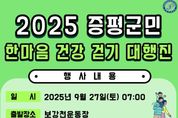 [한국기자연대] ‘2025 증평군민 한마음 건강걷기대행진’이 오는 27일 오전 7시, 증평 보강천 운동장에서 열린다. 증평군체육회(회장 최재옥)가 주관하는 이번 행사는 군민의 건강 증진과 화합 도모, 가족 중심의 여가 문화 확산을 위해 마련됐다. 걷기 코스는 보강천 운동장을 출발해 천변공원, 김득신 다리, 무궁화길을 거치는 약 3.5km 구간이다. 경사가 완만하고 자연경관이 뛰어나 남녀노소 누구나 부담 없이 참여할 수 있는 코스로 구성됐다. 사전 신청 없이 군민 누구나 자유롭게 참여할 수 있으며, 참가자 전원에게 기념품이 제공되고 다양한 경품 추첨도 함께 마련된다. 체육회는 이번 걷기 대행진을 통해 군민이 함께 어우러지는 건강한 공동체 분위기를 조성하고, 삶의 질 향상에도 기여할 것으로 기대하고 있다. 최재옥 회장은 “보강천변의 아름다운 경관을 따라 가족, 친구들과 함께 걸으며 건강도 챙기고 즐거운 추억도 만드는 시간이 되길 바란다”며 “많은 군민들의 참여를 부탁드린다”고 말했다.