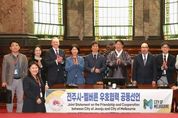 [한국기자연대] 전주시와 호주의 대표도시인 멜버른시가 상호 발전을 응원하는 동반자가 되기로 했다. 우범기 전주시장이 이끄는 전주시 대표단은 현지시간으로 지난 10일 호주 멜버른 시청을 방문해 케빈 로웨이 멜버른 시의원과 오진관 주 멜버른 대한민국 총영사, 마크 코크레인 멜버른 국제협력실 국장, 멜버른 지역 언론사 등이 참석한 가운데 양 도시간 교류를 더욱 발전시키기로 뜻을 모았다. 특히 양 도시는 이 자리에서 우호적 국제관계를 맺는 공동선언에 나섰다. 이날 서명한 협력 체결서에는 △문화예술교류 활성화 △문화산업 및 관광·도시디자인 협력 △지속가능한 문화경제 발전 △공공·민간협력 네트워크 구축 등의 내용이 담겨 있다. 전주시와의 국제교류를 약속한 멜버른시는 호주 빅토리아주 기초자치단체 중 핵심이 되는 도시로, 호주 내에서도 가장 살고 싶은 도시로 선정된 바 있다. 우 시장을 비롯한 전주시 대표단과 멜번시 관계자들은 우호 협력 체결 이후 문화예술과 관광, 스포츠, 경제, 도시디자인, 교육 등 다양한 분야의 교류 확대 방안을 논의하기도 했다. 전주시 대표단은 멜버른시청 방문에