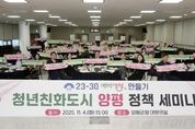 [한국기자연대] 양평군은 지난 4일 오후 3시 양평군청 대회의실에서 ‘청년친화도시 조성을 위한 미래 방향성과 차별화 전략’을 주제로 ‘23-30 매력 양평 만들기’ 정책세미나를 개최했다. 이번 세미나는 청년이 머물고 싶은 도시, 청년이 주도적으로 참여할 수 있는 ‘매력양평’ 구현을 위한 실질적인 정책 방향을 논의하고자 마련됐다. 이날 행사에는 전진선 양평군수를 비롯해 양평군의회, 양평군 정책자문단, 청년정책위원회, 청년단체 등 관계자 100여 명이 참석했다. 1부에서는 인사말씀과 축사, 기념촬영이 진행됐으며, 2부에서는 손신 교수(아신대학교, 양평군 정책자문단 위원)의 ‘청년친화도시 조성을 위한 미래 방향성 및 차별화 전략’과 길청순 이사장(지역농업네트워크 서울경기제주협동조합, 양평군 정책자문단 위원)의 ‘농업·농촌의 미래와 청년농업인’ 발제가 이어졌다. 전진선 양평군수는 “청년이 머물고 싶은 도시, 청년이 주도적으로 참여할 수 있는 ‘매력양평’을 만들기 위해 행정과 지역사회가 함께 힘을 모아야 한다”며 “오늘 세미나에서 제시된 다양한 의견을 향후 청년정책에 적극 반영하겠다”고 밝혔다. 한편, 양평