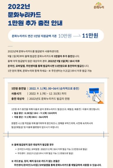 기존 발급자는 9월 1일(목)부터 순차적으로 자동재충전이 된다. 미발급자는 신규 발급 시 11만 원이 충전되며 12월 31일까지 사용 이후 소멸된다.