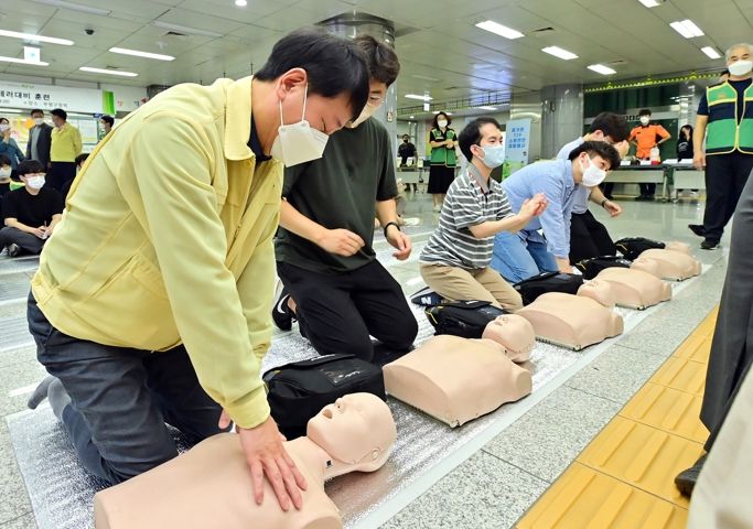 차준택 구청장과 부평구 직장민방위대원은 심폐소생술과 자동심장충격기 사용방법, 화생방용 방독면 착용방법 등 적 공습상황을 가정한 민방공 대피훈련과 생활안전교육을 직접 체험했다.
