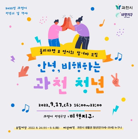 [한국기자연대] 과천시가 ‘청년의 날’인 9월 17일에 ‘안녕, 비행하는 과천 청년’이라는 주제로 청년공간 비행지구에서 기념 행사를 여는 가운데, 이날 행사에서 진행되는 청년마켓 판매(6팀) 및 사진전(10작품)에 참여할 청년을 내달 6일까지 모집한다고 25일 밝혔다.