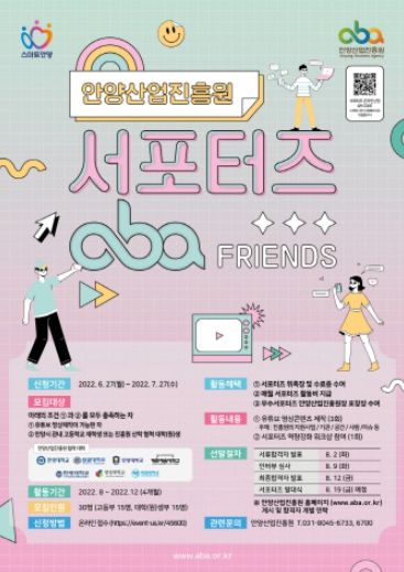 ‘aba프렌즈’라는 명칭은 진흥원의 영문명‘Anyang Business Agency’의 약자 ‘aba’와 진흥원과 시민이 함께한다는 의미를 담은‘프렌즈’가 합쳐진 것이며, 시민과 함께하여 진흥원을 알리고 소통하는 기회를 마련하고자 창단됐다.