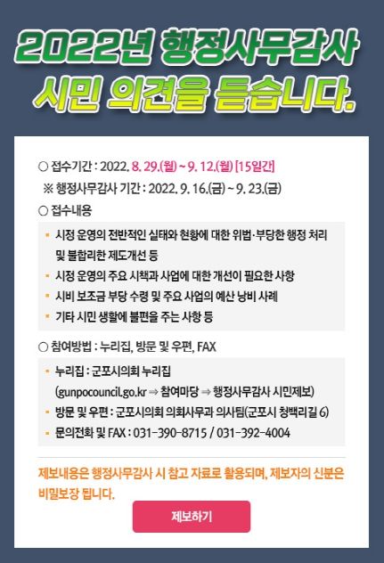 군포시 행정과 시의회 의정활동에 관심이 있는 누구나 제보에 참여할 수 있으며, 시의회 누리집(gunpocouncil.go.kr→참여마당→행정사무감사 시민제보)의 신설 게시판에 글을 작성하거나 방문 또는 우편 등 편한 방법을 선택해 의견을 제출하면 된다.