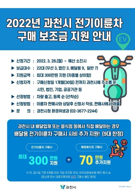 보조금은 접수일 기준 1개월 전까지 과천시에 주소를 둔 개인, 사업장이 위치한 법인, 기업 사업자 등이면 신청할 수 있으며, 전기이륜차 출고 순으로 지원금이 지급된다.