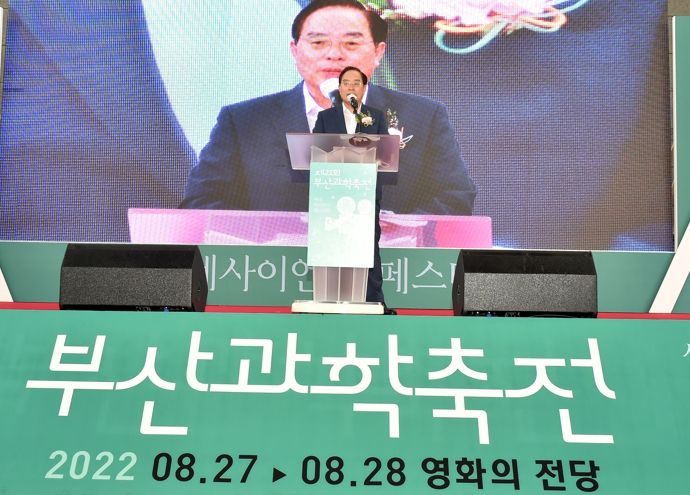 [한국기자연대] 하윤수 부산광역시교육감이 27일 오전 10시 해운대구 영화의 전당에서 열린 ‘제21회 부산과학축천 개막식’에서 축사를 하고, 부산과학기술상을 수여하고 있다.