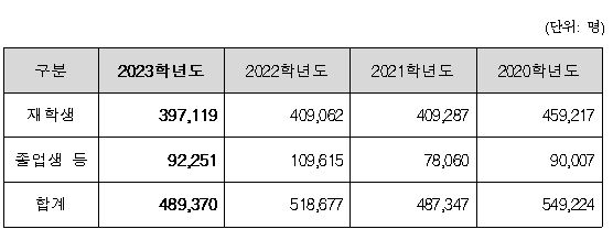 이번 9월 모의평가에 지원한 수험생은 489,370명으로, 재학생은 397,119명이고 졸업생 등 수험생은 92,251명이다.