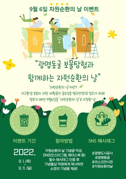 [한국기자연대] 광명도시공사는 오는 9월 6일 ‘자원순환의 날’을 맞아, 9월 1일부터 11일까지 광명동굴에서 자원 재활용과 환경보호의 중요성을 알리는 이벤트를 진행한다고 밝혔다.
