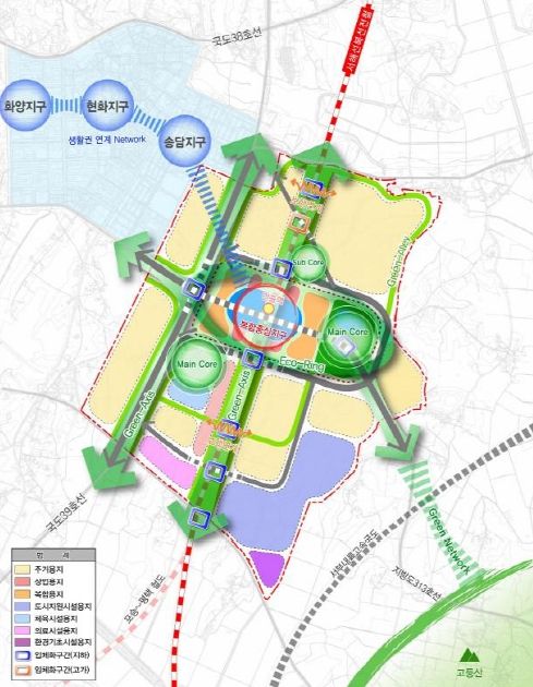 또한, 명품도시 조성을 위해 동서측에 대규모 중앙공원을 계획했고, 기반시설(철도·도로 등)로 단절되는 곳은 복합화 및 입체화를 통해 자연스럽게 연결될 수 있도록 구상했으며, 향후 개발계획 수립 시 기본구상이 실현될 수 있도록 기반시설 설치 등에 대해 별도의 가이드라인을 마련했다.